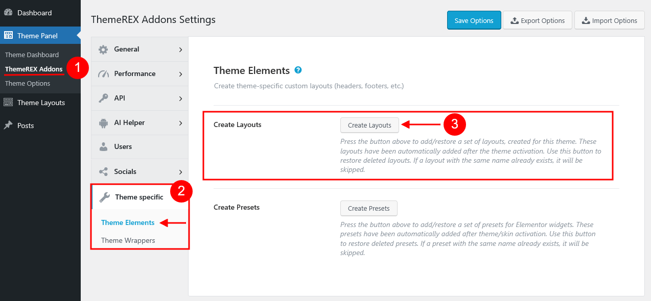 To make the theme look exactly as on the demo page, after the installation/activation of the ThemeREX Addons plugin and theme activation you would need to install the recommended plugins. Our theme supports two ways: through the "Theme Dashboard" menu or a prompt with a list of plugins to install. Let’s look closer to both.