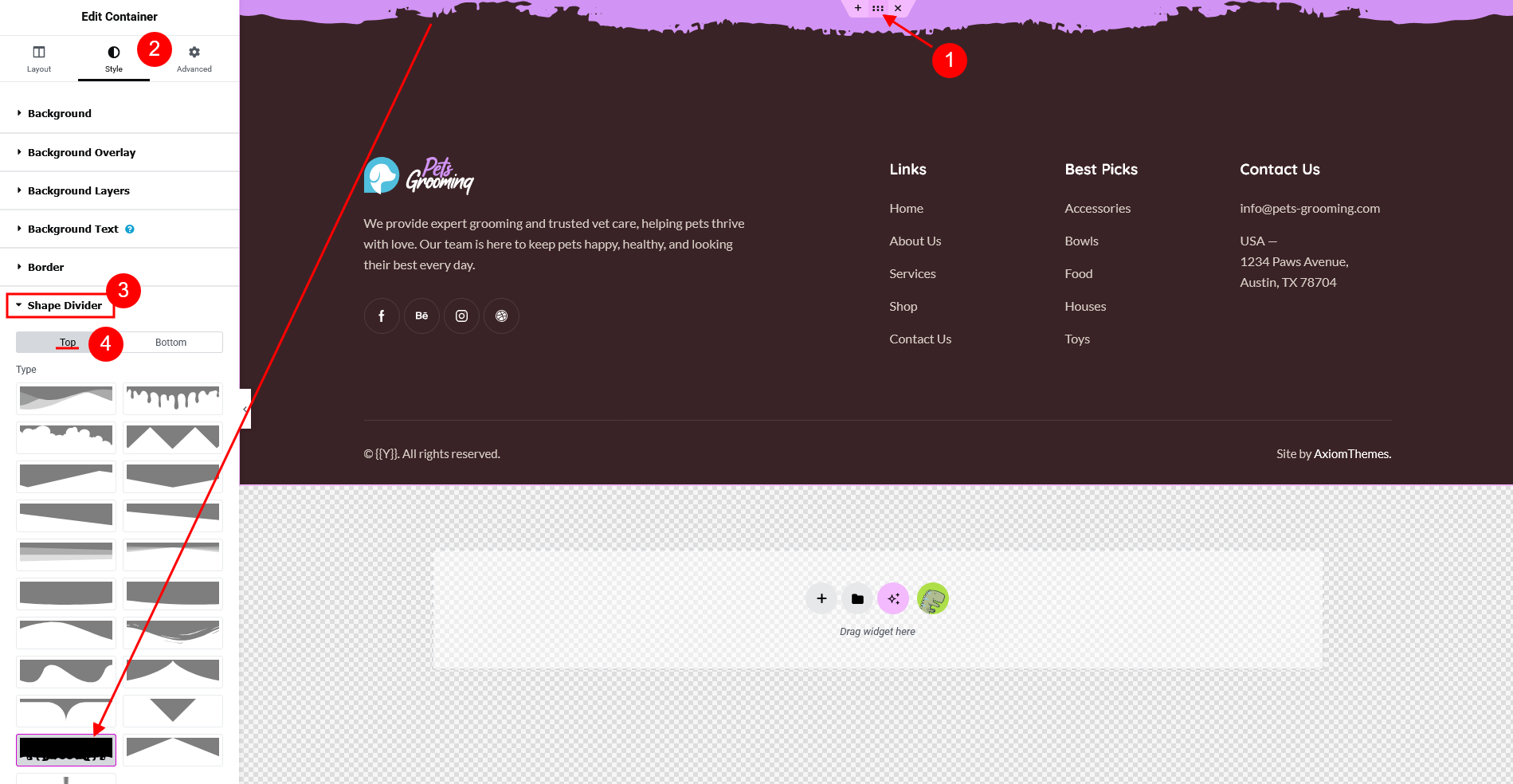 wp-content/themes/pets-grooming/skins/default/css/font-icons/config.json. Watch this video guide for more information. config.json file and website page builder with the available set of widgets/shortcodes in your theme may vary from the video provided!