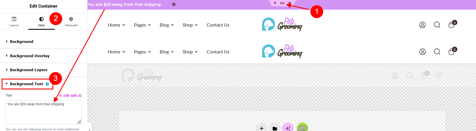 To decorate your theme, open your page through the Elementor page builder, find the page row (Elementor section or container) to which the "background text" functionality you would like to apply, and proceed to Edit Section/Container > Style > Background Text in the Elementor widgets panel. Here you can specify the text, text color, font family, font size, text shadow, and other parameters for your background line.