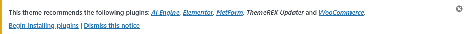 To make the theme look exactly as on the demo page, after the installation/activation of the ThemeREX Addons plugin and theme activation you would need to install the recommended plugins. Our theme supports two ways: through the "Theme Dashboard" menu or a prompt with a list of plugins to install. Let’s look closer to both.